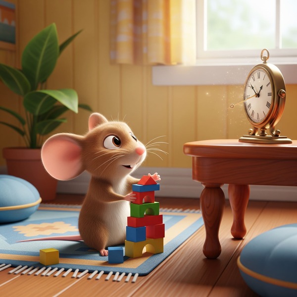 Настрій у малюка був кепський, тому вежа ніяк не виходила. Але коли мишеня нарешті збудувало її і поглянуло на годинник, виявилося, що стрілочка вже далеко від того місця, де була спочатку.