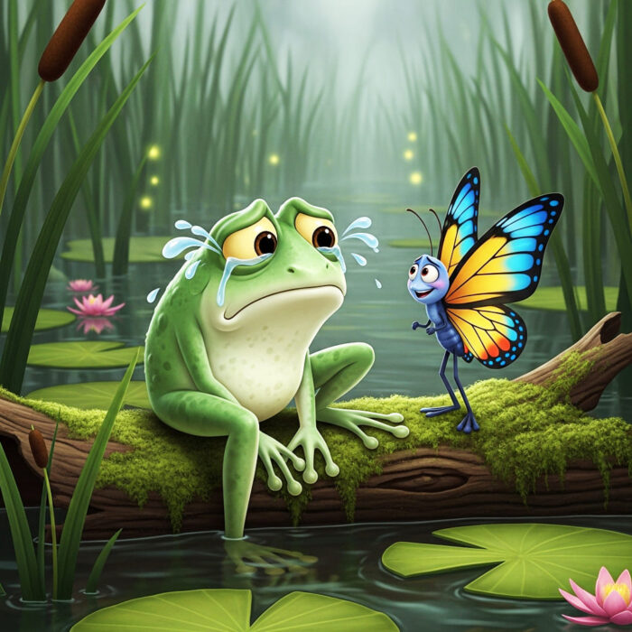 Жаба жалілася безперестану, і з очей у неї котилися величезні сльози. Вони капали метеликові на крильця, ті геть змокли й стали важкими. Через це й на душі метеликові стало важко. Сонечко вже не здавалося йому привабливим, хмаринки враз стали холодними, а день — сумним і похмурим. «З такою вагою не злетиш, — занепокоївся метелик. — Так я навіки залишуся в цьому болоті з жабою і лише слухатиму, як усе навколо погано, аж допоки не повірю. А там і сам на жабу перетворюся! Сидітиму і рюмсатиму цілими днями! Не хочу так!»