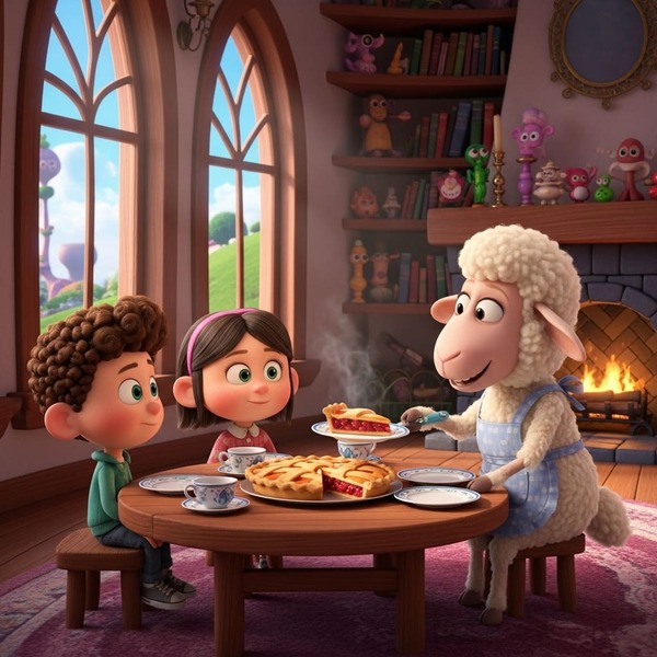 Вдома овечка налила дітям чаю з варенням і відрізала по шматку пирога.